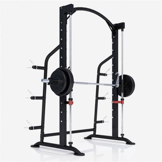 I mezzi rack offrono un eccellente equilibrio tra funzionalità e risparmio di spazio. Sono più piccoli dei power rack, ma offrono comunque una stabilità sufficiente per allenamenti intensi. Con un mezzo rack, puoi eseguire squat, distensioni su panca e molti altri esercizi in sicurezza. Si integra bene in spazi di allenamento più piccoli ed è un'ottima scelta per gli appassionati di fitness che cercano un attrezzo compatto ma versatile.